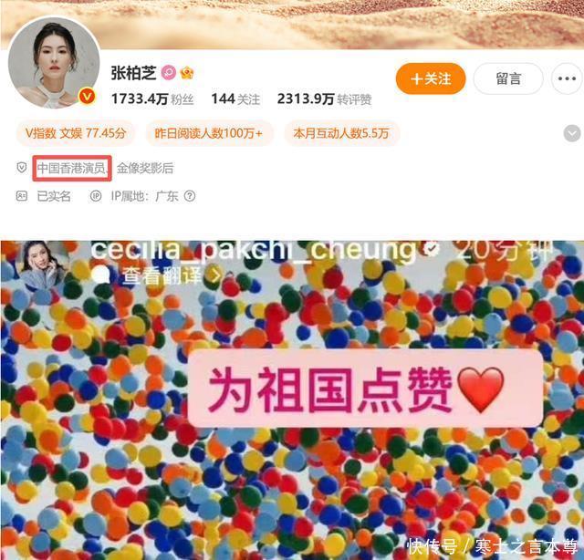 她的社交平台认证至今写着“中国香港演员”,从未更改。 九三阅兵那天她在外网发了阅兵现场放飞气球的照片,配文“为祖国点赞”。 也曾带孩子们画国旗,做手势舞,一遍一遍告诉他们“我们是中国人”。